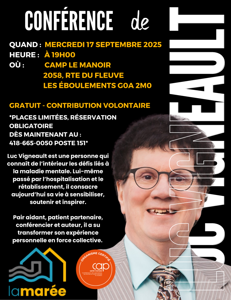 Conférence de Luc VigneaultQuand : Mercredi 17 septembre 2025 Heure : À 19h00 Où : Camp le manoir 2058, Rte du fleuve, Les éboulements G0a 2m0 Coût : gratuit - contribution volontaire
